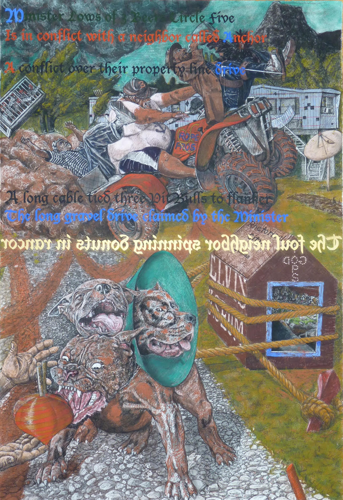 Gary Monroe is an artist from Knoxville, Tennessee that has exhibited nationally since the 1980s. He draws from the cultural idiosyncrasies of his native state to create narrative works. The subject matter ranges from Appalachian religious serpent handlers to the iconic Elvis Presley. Dante Alighieri’s Divina Commedia inspires Monroe’s most recent work, Comedy County Cocke. Whereas Dante is guided through the underworld by the poet Virgil, Monroe’s eccentric characters travel through an East Tennessee region known both for vice (moon-shining, cock fighting) and ecstatic religious practices.